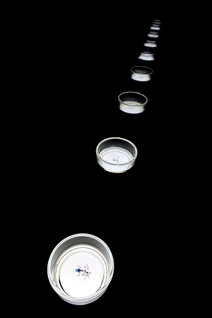 La petitesse des spécimens les placent hors de notre échelle de taille associative habituelle, soit le système comparatif d’un corps à l’autre par l’étalon qu’est notre taille humaine et qui nous permet d’appréhender physiquement le réel qui nous entoure. C’est en effet par leur système de présentation scientifique, qui prend la forme de coupelles en verre, appellées boîtes de Petri, illuminées par le dessous, qu’ils deviennent lumière et prennent leur importance dans l’espace. Vus de près, ils ressemblent à de précieuses gemmes ou à certains vitraux.