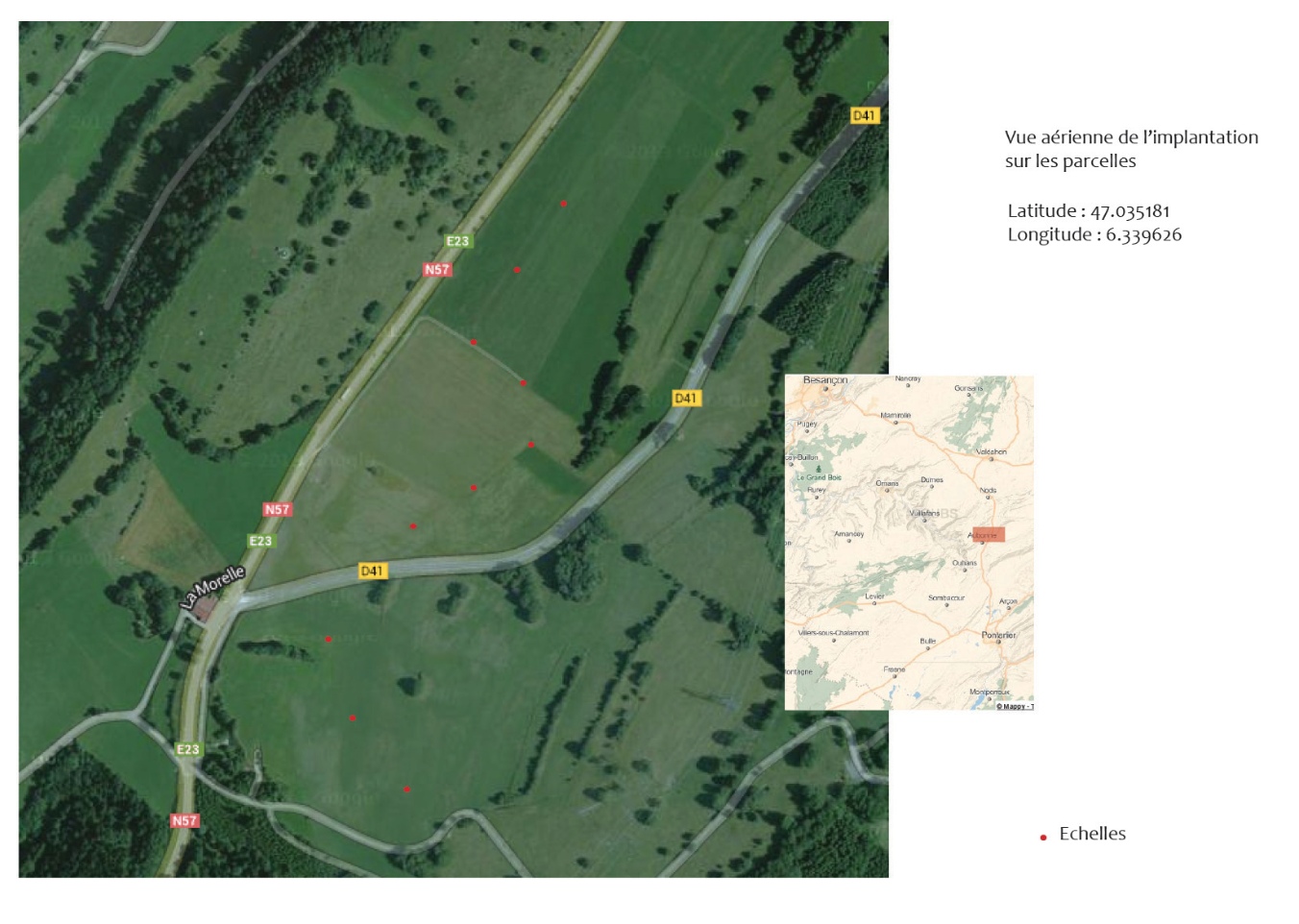 Ce projet est accompagné par un expert scientifique (la FREDON : Fédération régionale de défense contre les organismes nuisibles) qui m’a présenté 3 agriculteurs motivés et convaincus par la démarche.Ils ont mis leurs parcelles à disposition le long d’un axe routier fortement fréquenté entre Besançon et Pontarlier sur la commune d’Aubonne (Doubs 25).