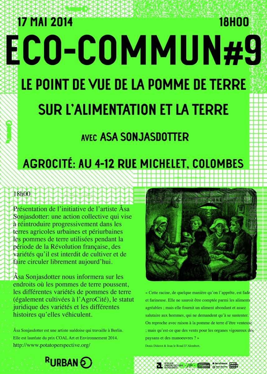 Avec Åsa Sonjasdotter : lauréate du Prix COAL 2014 pour son projet High Diversity qui consiste à réintégrer la culture d’une douzaine de variétés de pomme de terre apparues au cours des XVIIIe et XIXe siècles à et autour de Paris. Le projet artistique de la suédoise explore les liens entre évolution du tubercule et histoire politique française, considérant à la fois le rejet de certaines variétés de légumes dû à l’industrialisation de l’agriculture, la revitalisation de ces mêmes variétés par des fermiers ou des laboratoires de recherche, mais aussi les conditions d’inscription sur la liste des variétés nationales de la régulation européenne. Inspirée par les lieux de culture historique du féculent et l’esprit de résistance face à la standardisation et la production de la nourriture qui émerge à Paris au travers des initiatives des jardins partagés, l’artiste repère cinq zones de culture possibles parmi lesquelles le Jardin des plantes, celui des Tuileries, la Ferme de Marconville, le jardin partagé le Bois Dormoy et le jardin solidaire et partagé Cambrai.