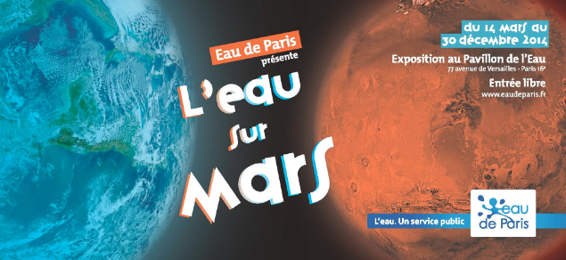 Du 14 mars au 30 décembre 2014, Eau de Paris présente au Pavillon de l’eau une exposition scientifique inédite de découverte de l’eau sur mars. L’entreprise publique souhaite ainsi sensibiliser de façon originale mais non moins actuelle les Parisiens à la nécessaire préservation de la ressource en eau et aux causes de sa disparition.