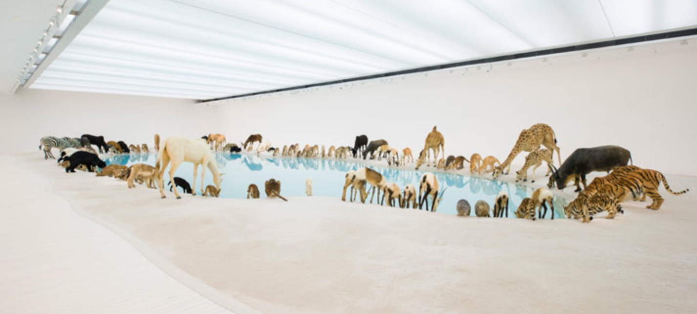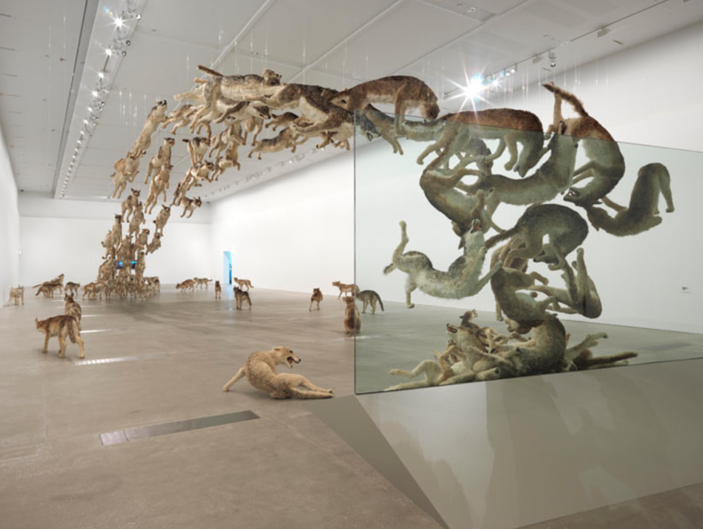 ‘Falling Back to Earth’, presented by Tourism and Events Queensland and Santos GLNG Project, features three major installations, including two newly commissioned works directly inspired by the landscapes of southeast Queensland, which the artist visited in 2011. The centrepiece of the exhibition — Heritage 2013 — features 99 replicas of animals from around the world, gathered together to drink from a blue lake surrounded by pristine white sand, reminiscent of the lakes of Moreton Bay’s islands. Heritage has been acquired for the Gallery’s Collection with the generous support of the Josephine Ulrick and Win Schubert Diversity Foundation through and with the assistance of the Queensland Art Gallery | Gallery of Modern Art Foundation. The second installation,Eucalyptus 2013 responds to the ancient trees of Lamington National Park in the Gold Coast hinterland, while the third — Head On 2006 — is a striking installation of 99 artificial wolves leaping en masse into a glass wall, on display in Australia for the first time.