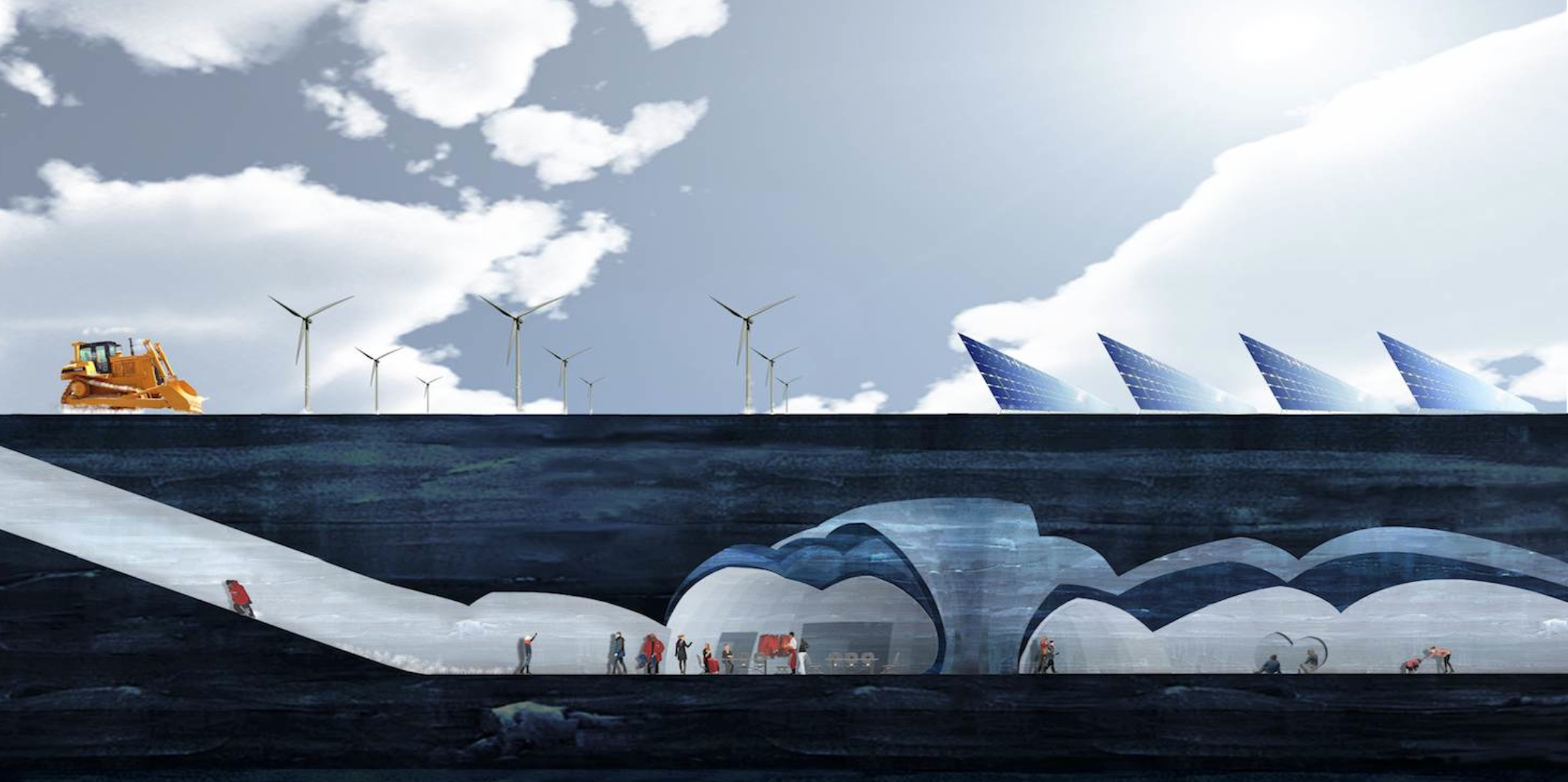 Iceberg Living Station A speculative design by David Garcia / MAP Architects (Denmark) for a future research station made entirely from ice, Iceberg Living Station negates the need to transport foreign materials to Antarctica. The station will be holed out of a large iceberg, using caterpillar excavators that are traditionally used to clear snow. It will eventually melt, resolving the issue of removing it at the end of its life course.